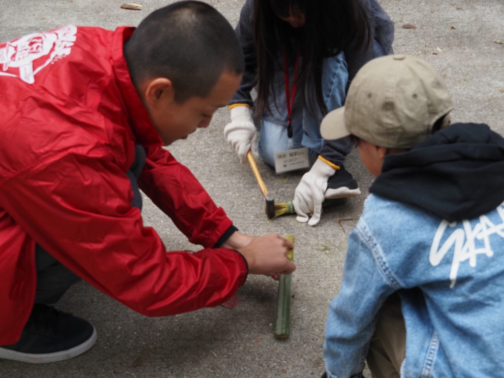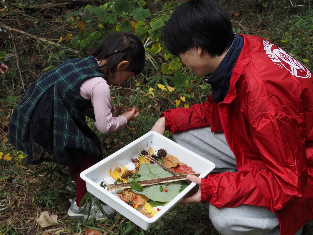 In one of the main programs, bamboo brush making, participants shaved pieces of bamboo to craft their own brushes. Using the brushes they had made, they created large calligraphy works, boldly expressing their feelings toward the forest and nature. In the Plant Exploration Team activity, children explored Yokohama National University’s Tokiwano Forest and engaged in various creative projects using natural materials such as fallen leaves and nuts, including making masks inspired by what they found. Through these activities, the students themselves also had valuable opportunities to engage deeply with the natural environment of Yokohama National University and to learn about the value of utilizing these natural resources.